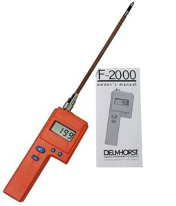 Delmhorst F2000 Digital Hay Moisture 10″ Probe Meter Package measures moisture levels in the windrow and standard bales. Includes carrying case. Delmhorst Hay Probe Kit (Meter, Handle, and 10 Inch Probe) makes one-hand operation easy when baling This kit contains: F2000 Delmhorst Hay Moisture Meter and Pictured Accessories with Carrying Case. F2000 Delmhorst Hay Moisture Meter: This digital meter is used to check the moisture content of hay before baling and to check the moisture content of bales for safe storage. It also features an adjustable, audible set-point to alert you when a pre-selected % of moisture has been reached. Features: Microcontroller circuit Averages up to 100 accumulated readings Displays average and highest of accumulated readings Measures moisture content over the range of 6%-40% Three-year warranty Great for the hay producer who utilizes the memory features for enhanced quality control Deluxe Package Includes: F2000 Digital Hay Meter H-4 Handle 830-2 10″ Probe 831 Windrow Probe Carrying CaseDelmhorst F2000 Digital Hay Moisture 10″ Probe Meter Package measures moisture levels in the windrow and standard bales. Includes carrying case. Delmhorst Hay Probe Kit (Meter, Handle, and 10 Inch Probe) makes one-hand operation easy when baling This kit contains: F2000 Delmhorst Hay Moisture Meter and Pictured Accessories with Carrying Case. F2000 Delmhorst Hay Moisture Meter: This digital meter is used to check the moisture content of hay before baling and to check the moisture content of bales for safe storage. It also features an adjustable, audible set-point to alert you when a pre-selected % of moisture has been reached. Features: Microcontroller circuit Averages up to 100 accumulated readings Displays average and highest of accumulated readings Measures moisture content over the range of 6%-40% Three-year warranty Great for the hay producer who utilizes the memory features for enhanced quality control Deluxe Package Includes: F2000 Digital Hay Meter H-4 Handle 830-2 10″ Probe 831 Windrow Probe Carrying Case