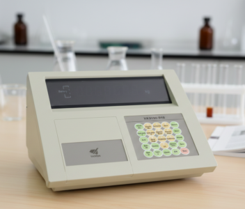 • Foreground: The device sits prominently on a clean, light-wood laboratory desk.